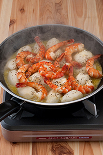 - 在蒸鍋里抹上一層橄欖油,放入大蒜炒熱,隨后加芋頭。澆一圈白葡萄酒,蓋上鍋蓋。弱火蒸5-6分鐘后放蝦。